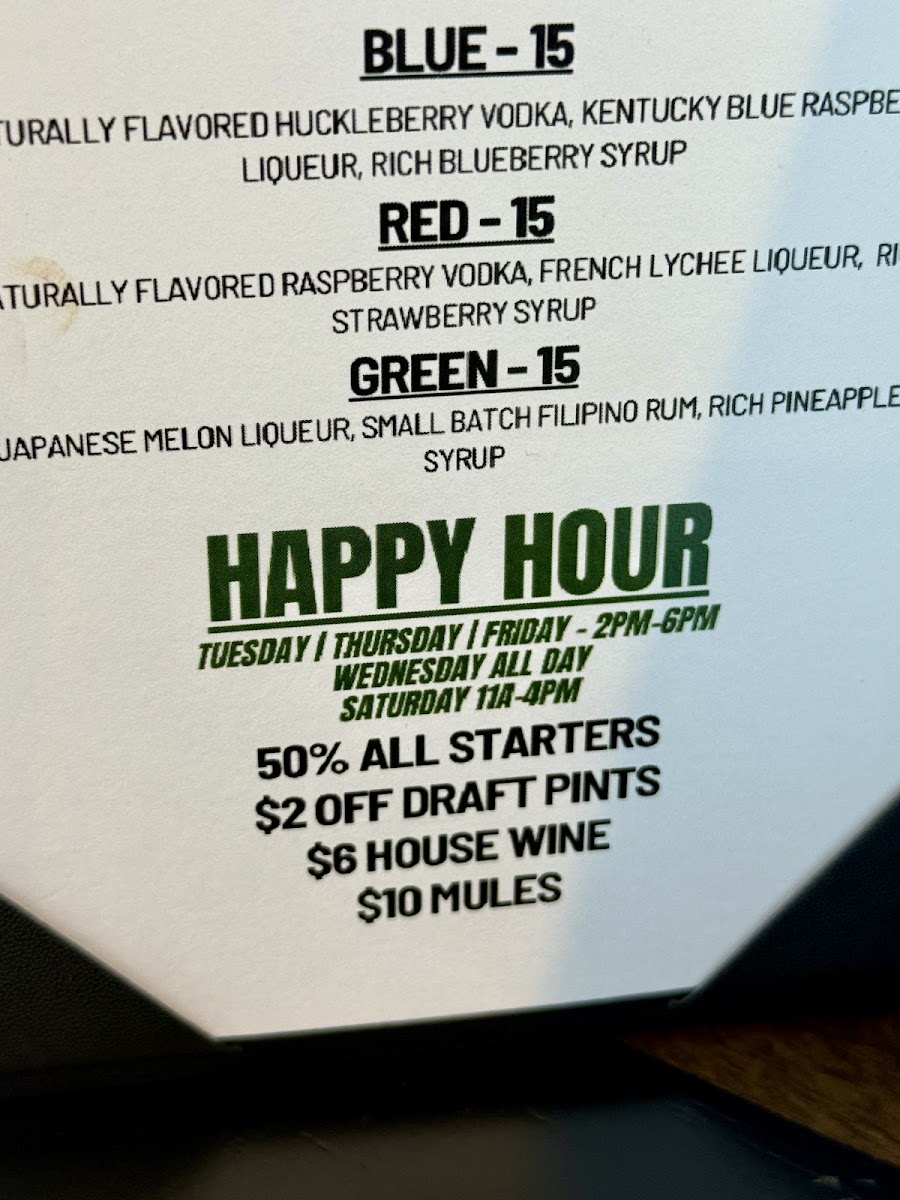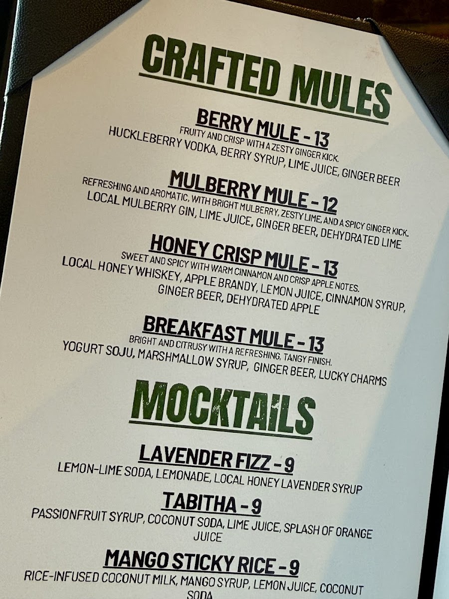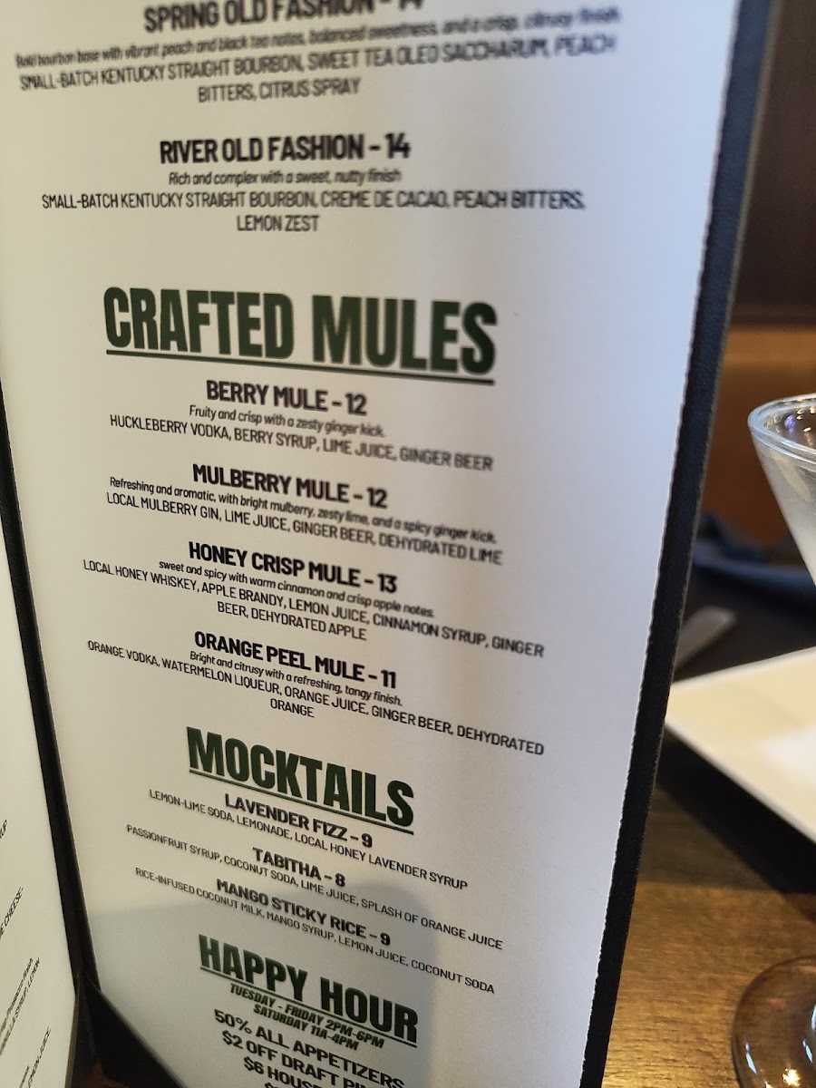“ Fantastic service and the atmosphere was great. The Honey Crisp Mule was excellent. The seared salmon was a bit overdone, otherwise this would have been five stars. Definitely will return for another fun dining experience. Give this place a try! ”